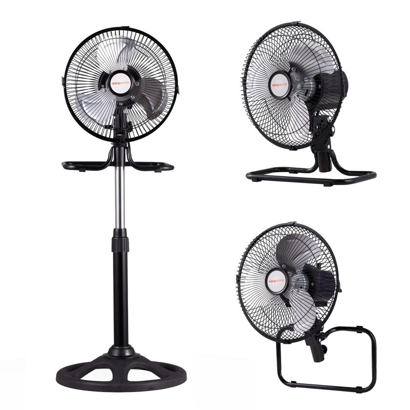 Ventilador 10?Código de producto: KJH-FH1306Especificaciones:• 3 en 1: Colgar – Mesa – Pie• 3 velocidades• 3 paletas metálicas• Regulable en altura• Potencia: 65W