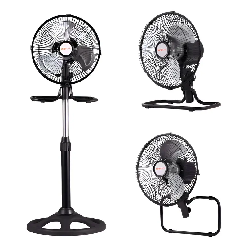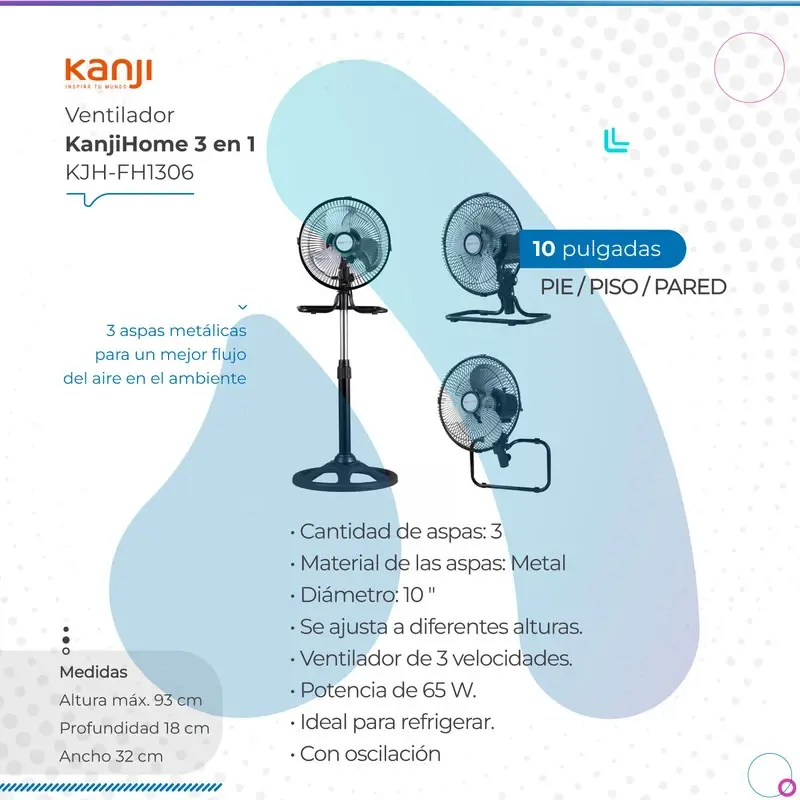 Ventilador Kanji Home 3 En 1 10" KJH-FH1306 Negro. Especificaciones técnicas: Características que te van a encantar: • 3 en 1: Colgar – Mesa – Pie • 3 velocidades • 3 paletas metálicas • Regulable en altura • Potencia: 60W