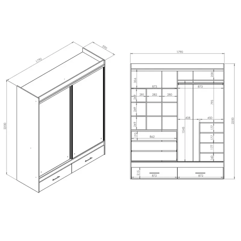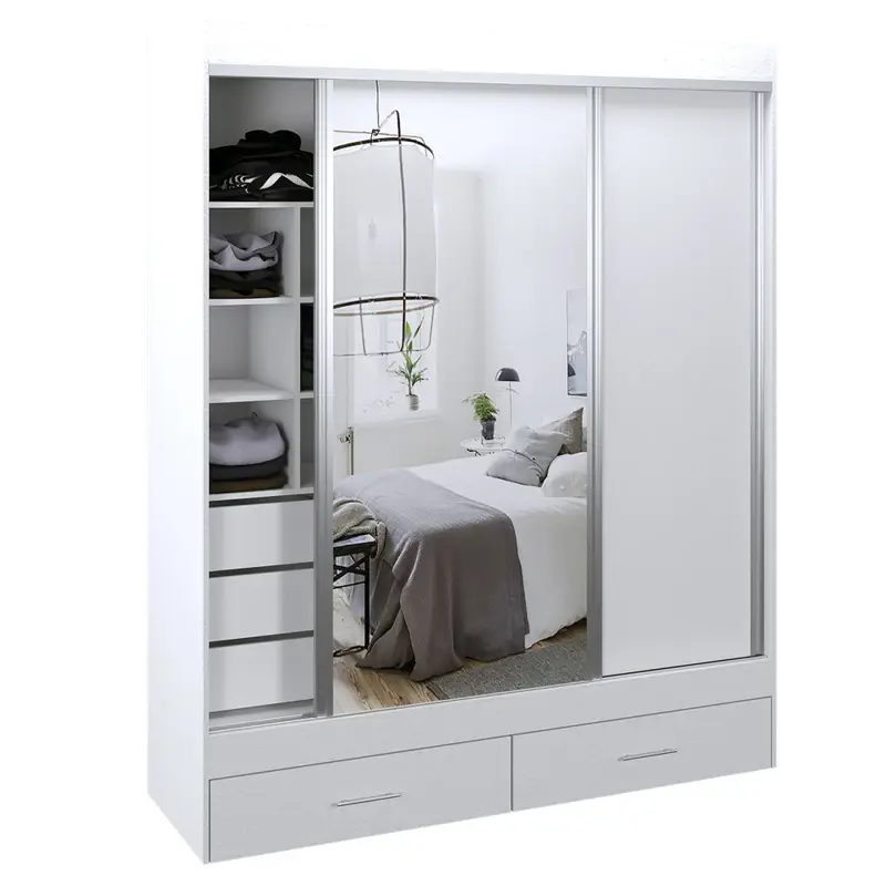 Vestidor Premium con herrajes de aluminio y filos de pvc. 2 puertas corredizas. 1 Puerta con espejo. Distribución interna optimizada. Profundidad de 60 cm útiles. Capacidad de ampliación modular en sus laterales, parte superior o inferior. Del lado izquierdo podes armarlo con 4 variantes según la necesidad. En su base posee 2 cajones vistos con correderas telescópicas.