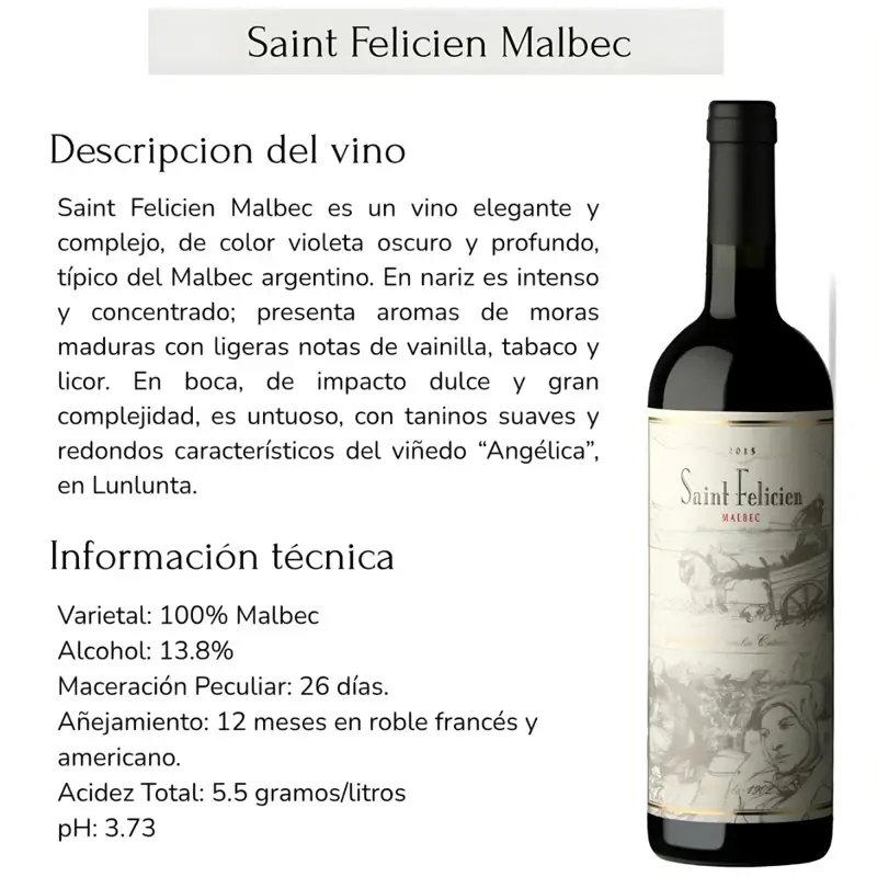 Saint Felicien Malbec es un vino elegante y complejo, de color violeta oscuro y profundo, típico del Malbec argentino. En nariz es intenso y concentrado; presenta aromas de moras maduras con ligeras notas de vainilla, tabaco y licor. En boca, de impacto dulce y gran complejidad, es untuoso, con taninos suaves y redondos característicos del viñedo "Angélica", en Lulunta.