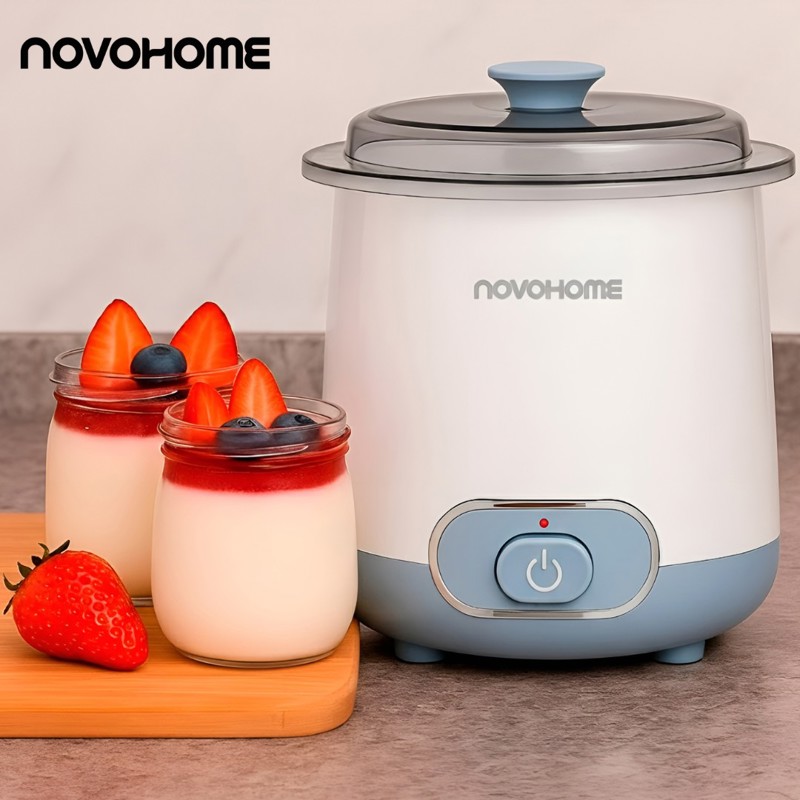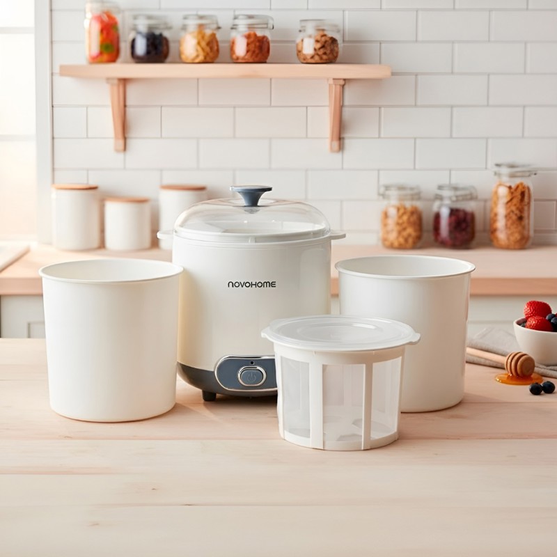 La yogurtera Novohome es un electrodoméstico de alta calidad, diseño elegante y funcional que pronto se convertirá en un imprescindible en tu cocina. Es la aliada perfecta para preparar yogur cremoso y delicioso, incluso un auténtico yogur griego!. Gracias a su capacidad de 1.5 litros, podrás hacer grandes tandas, perfectas para compartir en familia o disfrutar individualmente. Además, su tapa transparente te permite controlar el proceso de fermentación sin complicaciones. Prepara yogur casero, natural y sin aditivos con solo pulsar un botón.